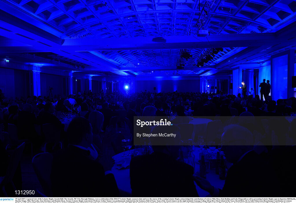 29 April 2017; A general view of the Leinster Rugby Awards Ball. The Awards, MC’d by Darragh Maloney, were a celebration of the 2016/17 Leinster Rugby season to date and over the course of the evening Leinster Rugby acknowledged the contributions of retirees Mike Ross, Eóin Reddan and Luke Fitzgerald as well as presenting Leinster Rugby caps to departees Bill Dardis, Hayden Triggs, Mike McCarthy, Zane Kirchner and Dominic Ryan. Former Leinster Rugby team doctor Professor Arthur Tanner was posthumously inducted into the Guinness Hall of Fame. Some of the Award winners on the night included; Gonzaga College (Deep River Rock School of the Year), David Hicks, De La Salle Palmerston (Beauchamps Contribution to Leinster Rugby Award), Clontarf FC (CityJet Senior Club of the Year), Coláiste Chill Mhantáin (Irish Independent Development School of the Year Award), Athy RFC (Bank of Ireland Junior Club of the Year). Professional award winners on the night included Laya Healthcare Young Player of the Year - Joey Carbery, Life Style Sports Supporters Player of the Year - Isa Nacewa, Canterbury Tackle of the Year – Isa Nacewa, Irish Independnet Try of the Year – Adam Byrne and Bank of Ireland Players’ Player of the Year – Luke McGrath. Clayton Hotel, Burlington Road, Dublin 4. Photo by Stephen McCarthy/Sportsfile