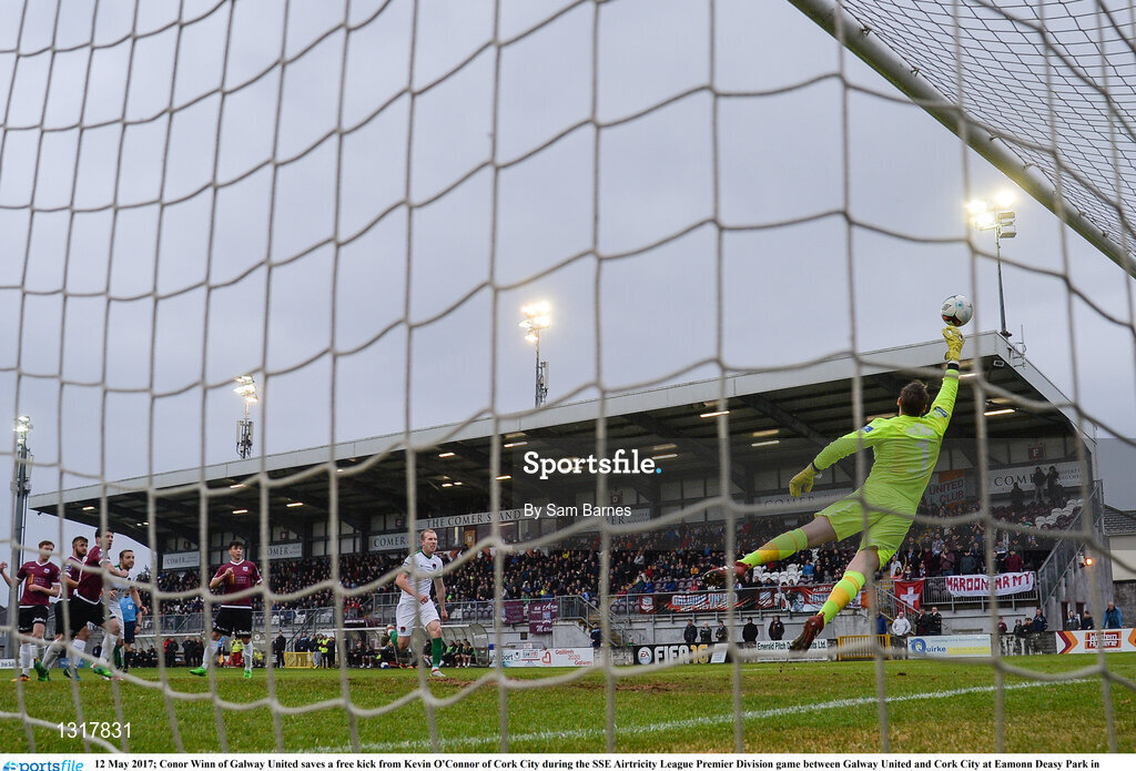 12 May 2017; Conor Winn of Galway United saves a free kick from Kevin O'Connor of Cork City during the SSE Airtricity League Premier Division game between Galway United and Cork City at Eamonn Deasy Park in Galway. Photo by Sam Barnes/Sportsfile