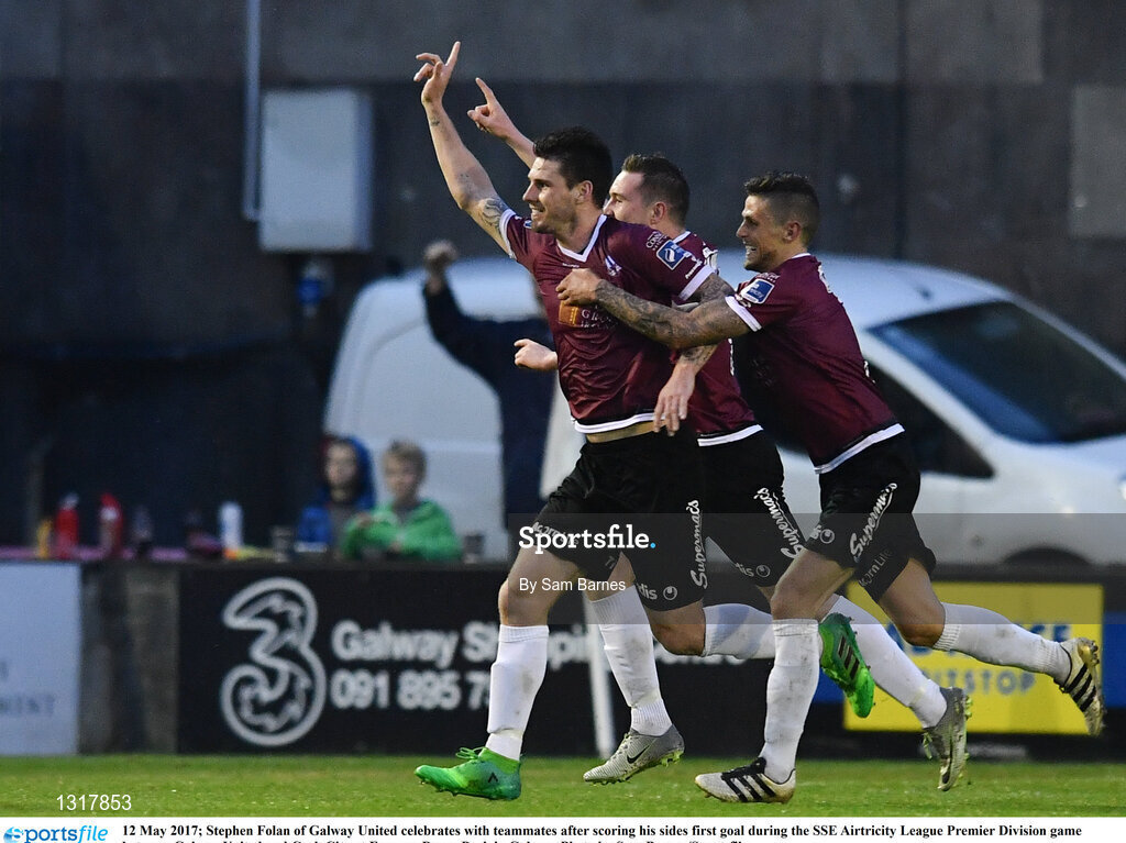 12 May 2017; Stephen Folan of Galway United celebrates with teammates after scoring his sides first goal during the SSE Airtricity League Premier Division game between Galway United and Cork City at Eamonn Deasy Park in Galway. Photo by Sam Barnes/Sportsfile