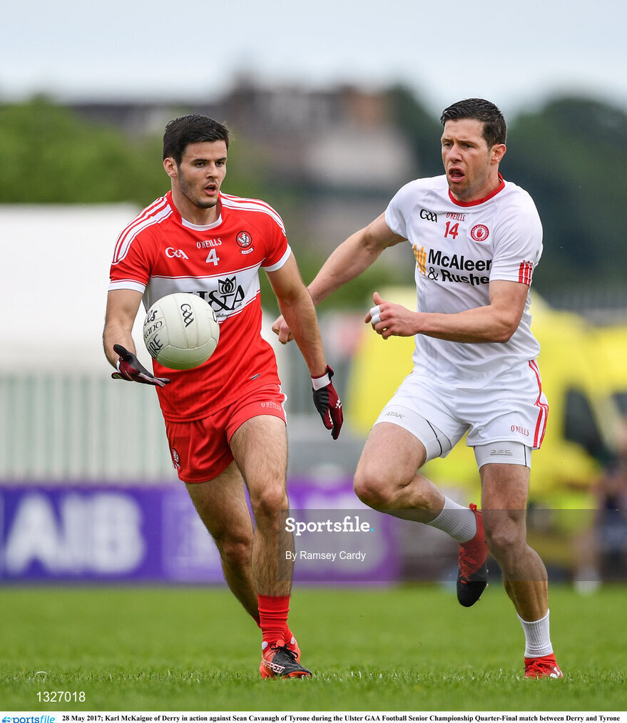 28 May 2017; Karl McKaigue of Derry in action against Sean Cavanagh of Tyrone during the Ulster GAA Football Senior Championship Quarter-Final match between Derry and Tyrone at Celtic Park in Derry. Photo by Ramsey Cardy/Sportsfile