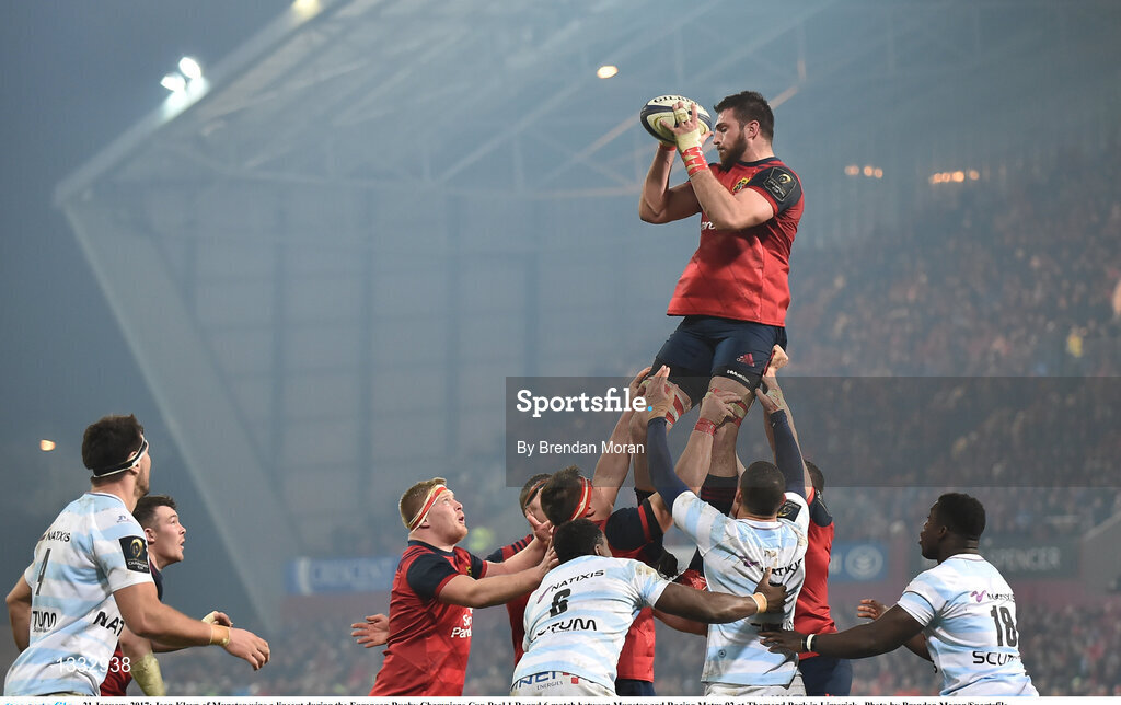 21 January 2017; Jean Kleyn of Munster wins a lineout during the European Rugby Champions Cup Pool 1 Round 6 match between Munster and Racing Metro 92 at Thomond Park in Limerick. Photo by Brendan Moran/Sportsfile