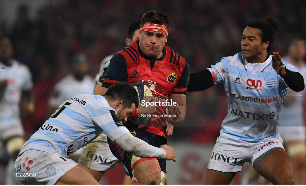 21 January 2017; CJ Stander of Munster in action against Brice Dulin, left, and Teddy Thomas of Racing 92 during the European Rugby Champions Cup Pool 1 Round 6 match between Munster and Racing Metro 92 at Thomond Park in Limerick. Photo by Brendan Moran/Sportsfile