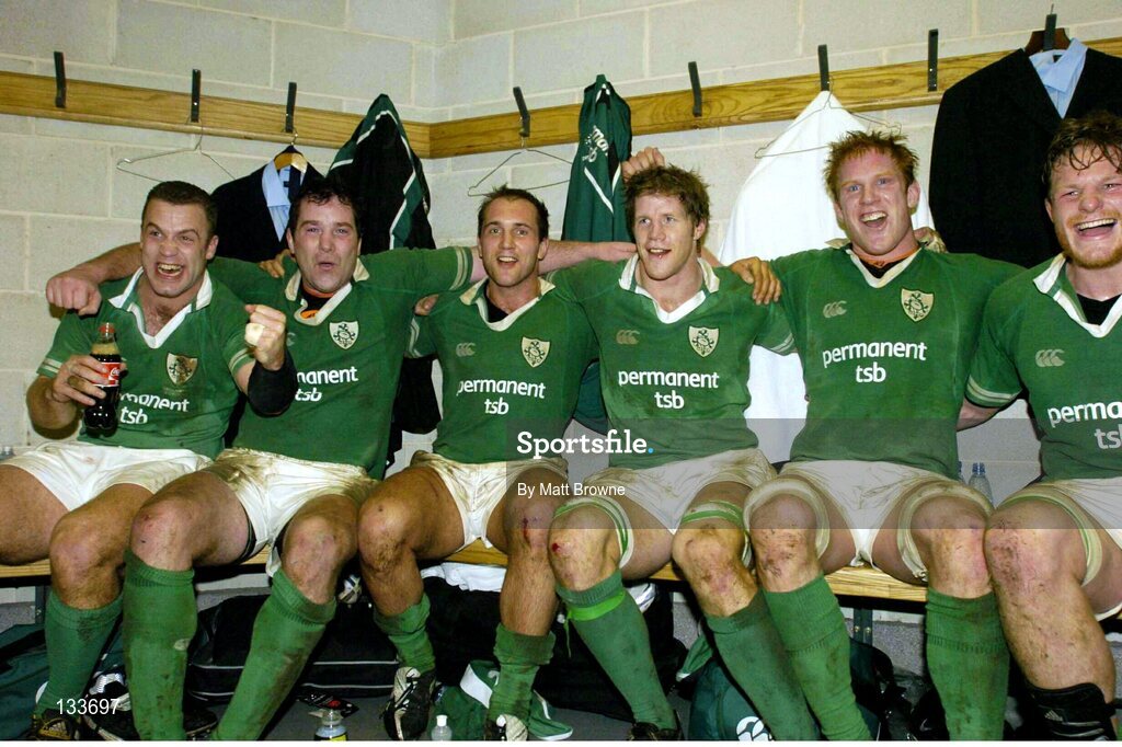 6 March 2004; Ireland players, from left, Kevin Maggs, Anthony Foley, Keith Gleeson, Simon Easterby, Paul O'Connell and Malcolm O'Kelly celebrate in the dressing room after victory over England. RBS 6 Nations Championship 2003-2004, England v Ireland, Twickenham, England. Picture credit: Matt Browne / SPORTSFILE