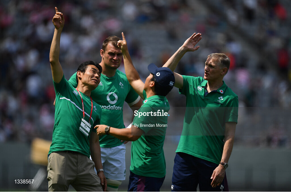 24 June 2017; Ireland head coach Joe Schmidt, right, consults with his team liaison officers on the direction of the sun before the international rugby match between Japan and Ireland in the Ajinomoto Stadium in Tokyo, Japan. Photo by Brendan Moran/Sportsfile