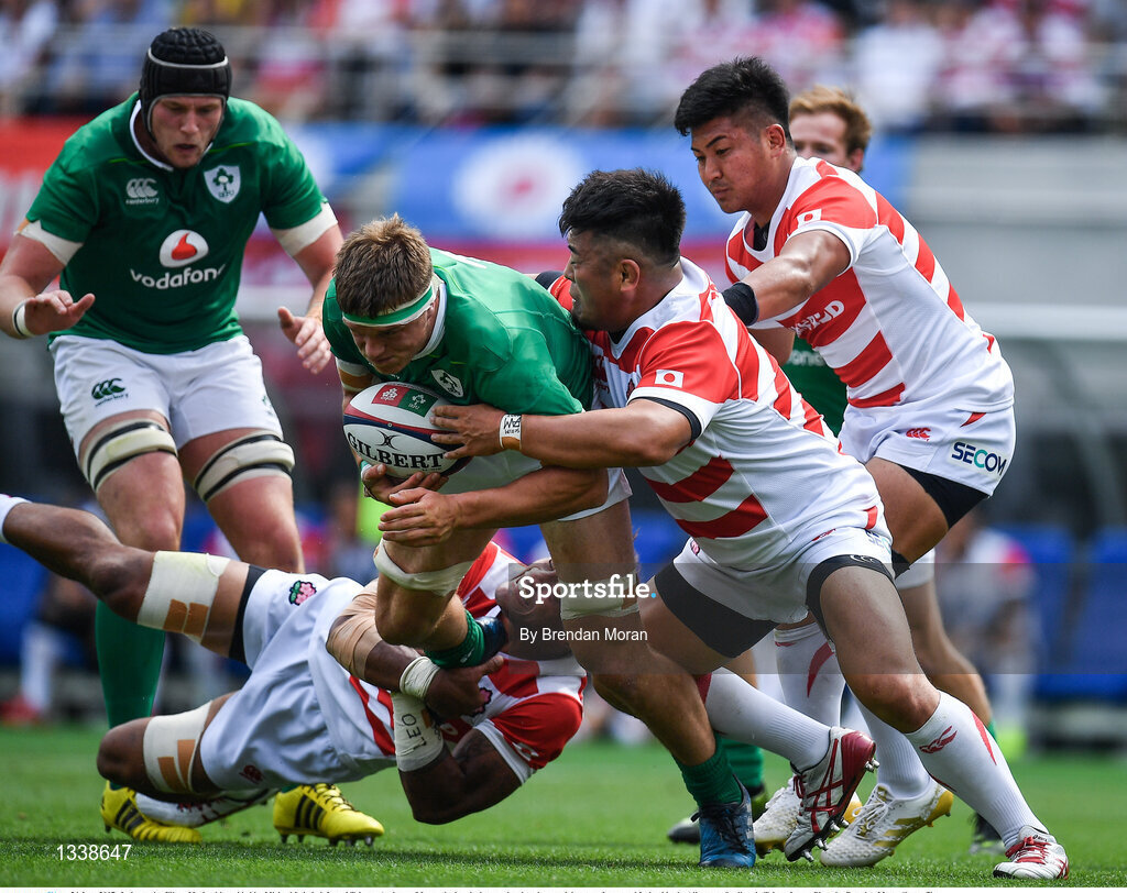 24 June 2017; Josh van der Flier of Ireland is tackled by Michael Leitch, left, and Takuma Asahara of Japan during the international rugby match between Japan and Ireland in the Ajinomoto Stadium in Tokyo, Japan. Photo by Brendan Moran/Sportsfile