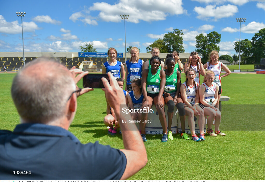 24 June 2017; The 4 x 100 metre relay podium at the Irish Life Health Tailteann School’s Interprovincial Schools Championships at Morton Stadium in Santry, Dublin. Photo by Ramsey Cardy/Sportsfile