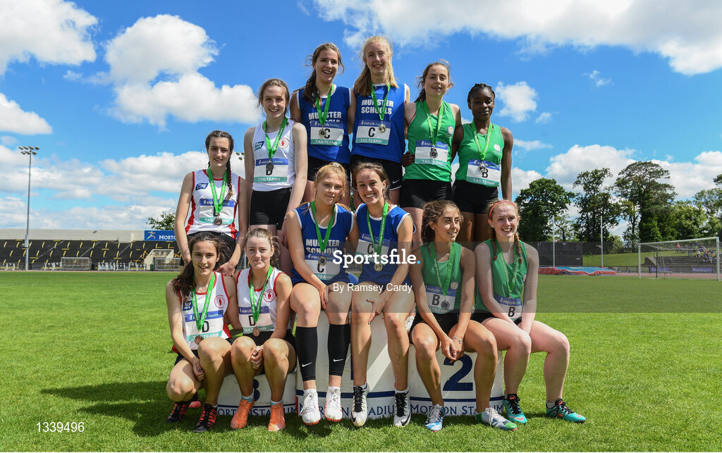 24 June 2017; The 4 x 300 metre relay podium at the Irish Life Health Tailteann School’s Interprovincial Schools Championships at Morton Stadium in Santry, Dublin. Photo by Ramsey Cardy/Sportsfile