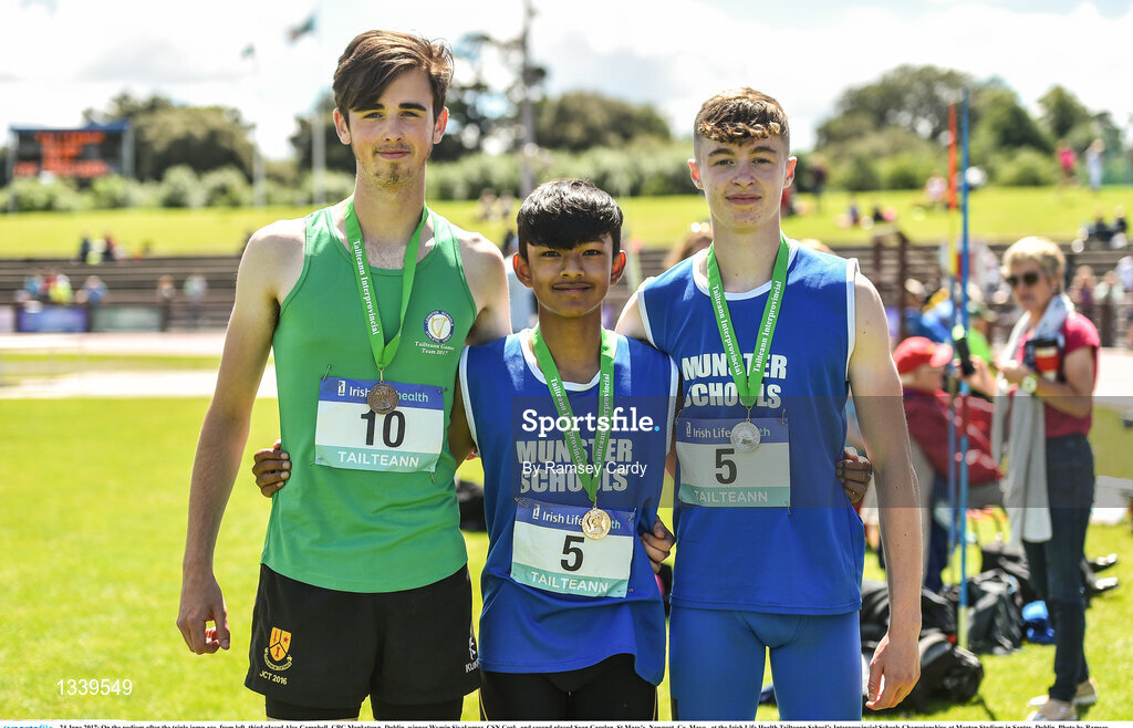 24 June 2017; On the podium after the triple jump are, from left, third placed Alex Campbell, CBC Monkstown, Dublin, winner Wymin Sivakumar, CSN Cork, and second placed Sean Carolan, St Mary's, Newport, Co. Mayo, ,at the Irish Life Health Tailteann School’s Interprovincial Schools Championships at Morton Stadium in Santry, Dublin. Photo by Ramsey Cardy/Sportsfile