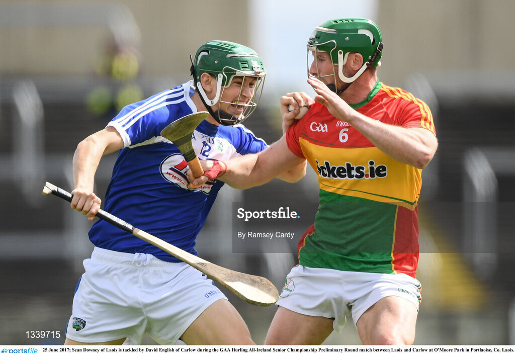 25 June 2017; Sean Downey of Laois is tackled by David English of Carlow during the GAA Hurling All-Ireland Senior Championship Preliminary Round match between Laois and Carlow at O'Moore Park in Portlaoise, Co. Laois. Photo by Ramsey Cardy/Sportsfile