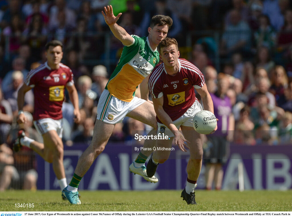 17 June 2017; Ger Egan of Westmeath in action against Conor McNamee of Offaly during the Leinster GAA Football Senior Championship Quarter-Final Replay match between Westmeath and Offaly at TEG Cusack Park in Mullingar, Co Westmeath. Photo by Piaras Ó Mídheach/Sportsfile