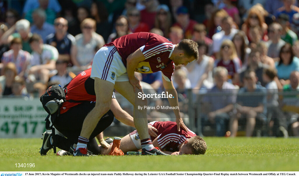 17 June 2017; Kevin Maguire of Westmeath checks on injured team-mate Paddy Holloway during the Leinster GAA Football Senior Championship Quarter-Final Replay match between Westmeath and Offaly at TEG Cusack Park in Mullingar, Co Westmeath. Photo by Piaras Ó Mídheach/Sportsfile