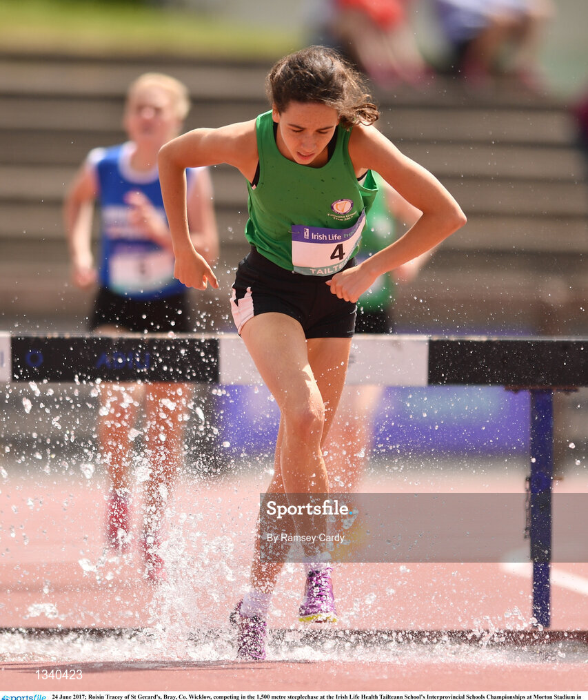 24 June 2017; Roisin Tracey of St Gerard's, Bray, Co. Wicklow, competing in the 1,500 metre steeplechase at the Irish Life Health Tailteann School’s Interprovincial Schools Championships at Morton Stadium in Santry, Dublin. Photo by Ramsey Cardy/Sportsfile
