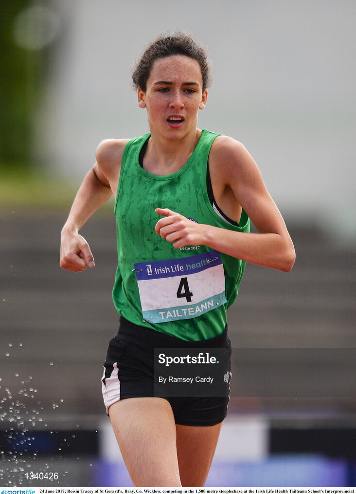 24 June 2017; Roisin Tracey of St Gerard's, Bray, Co. Wicklow, competing in the 1,500 metre steeplechase at the Irish Life Health Tailteann School’s Interprovincial Schools Championships at Morton Stadium in Santry, Dublin. Photo by Ramsey Cardy/Sportsfile