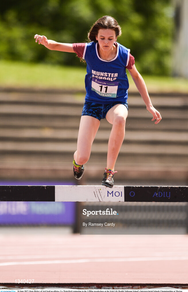 24 June 2017; Kate Hickey of Ard Scoil na nDeise, Co. Waterford competing in the 1,500m steeplechase at the Irish Life Health Tailteann School’s Interprovincial Schools Championships at Morton Stadium in Santry, Dublin. Photo by Ramsey Cardy/Sportsfile