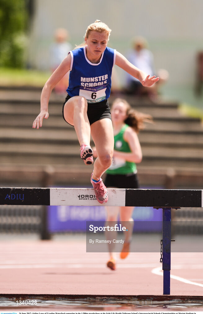24 June 2017; Aisling Lowe of Ursuline Waterford competing in the 1,500m steeplechase at the Irish Life Health Tailteann School’s Interprovincial Schools Championships at Morton Stadium in Santry, Dublin. Photo by Ramsey Cardy/Sportsfile