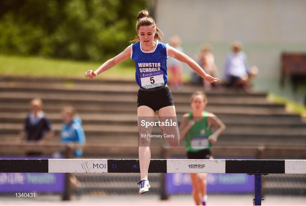 24 June 2017; Alannah Neff of Carrigaline CS, Carrigaline, Co. Cork, competing in the 1,500m steeplechase at the Irish Life Health Tailteann School’s Interprovincial Schools Championships at Morton Stadium in Santry, Dublin. Photo by Ramsey Cardy/Sportsfile