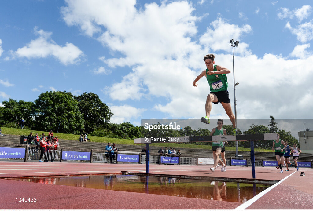 24 June 2017; Aaron Donnelly of Bray, Co. Wicklow, leads the 1,500 metre steeplechase at the Irish Life Health Tailteann School’s Interprovincial Schools Championships at Morton Stadium in Santry, Dublin. Photo by Ramsey Cardy/Sportsfile