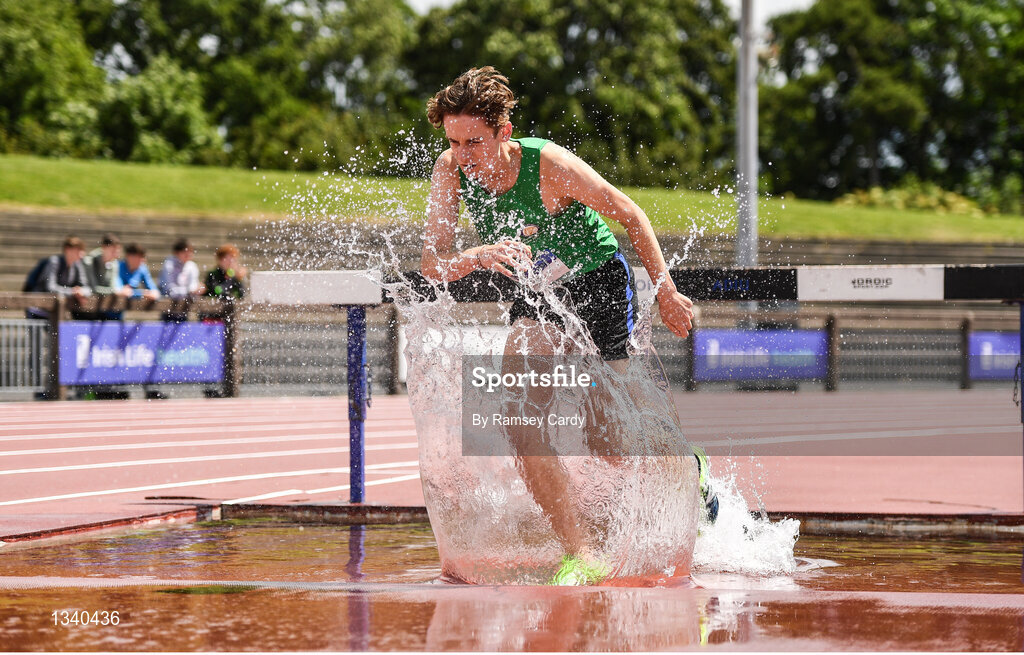 24 June 2017; Aaron Donnelly of Bray, Co. Wicklow, leads the 1,500 metre steeplechase at the Irish Life Health Tailteann School’s Interprovincial Schools Championships at Morton Stadium in Santry, Dublin. Photo by Ramsey Cardy/Sportsfile