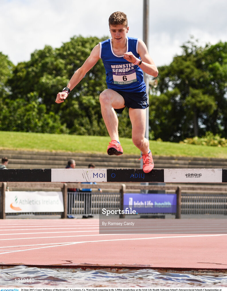 24 June 2017; Conor Mullaney of Blackwater C.S, Lismore, Co. Waterford competing in the 1,500m steeplechase at the Irish Life Health Tailteann School’s Interprovincial Schools Championships at Morton Stadium in Santry, Dublin. Photo by Ramsey Cardy/Sportsfile
