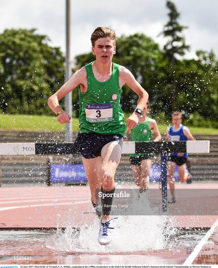 24 June 2017; Oisin Kelly of Newpark C.S., Dublin, competing in the 1,500m steeplechase at the Irish Life Health Tailteann School’s Interprovincial Schools Championships at Morton Stadium in Santry, Dublin. Photo by Ramsey Cardy/Sportsfile