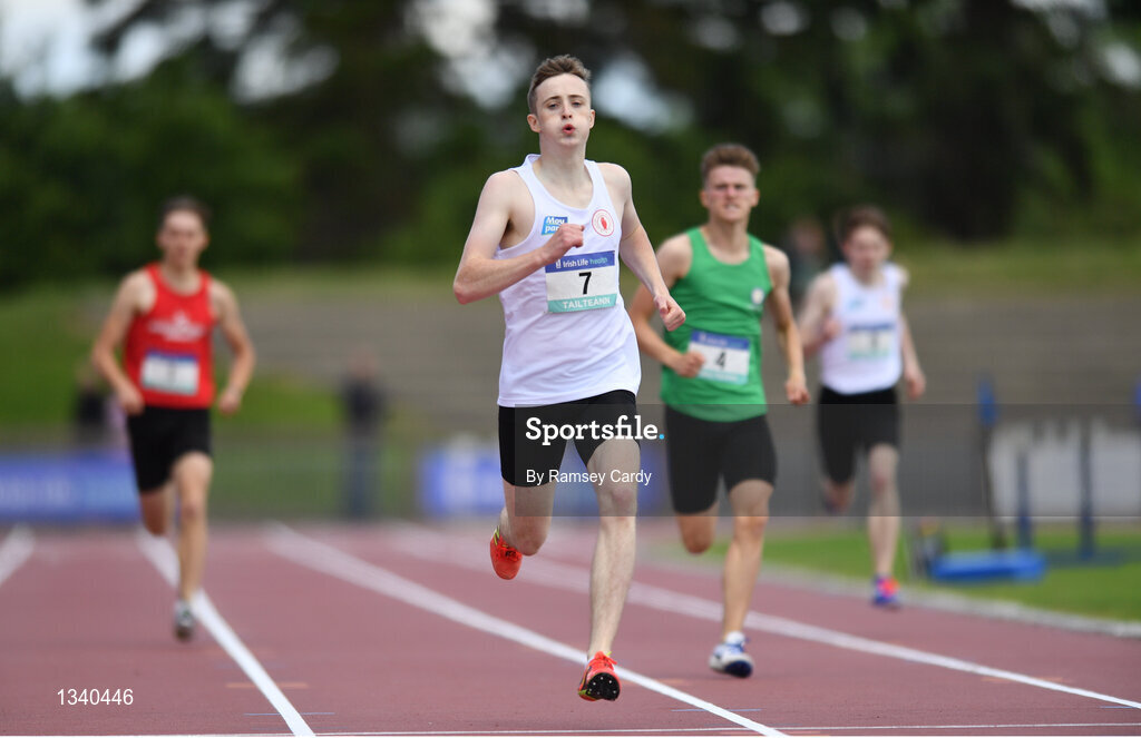 24 June 2017; Adam Hughes of Regent House, Newtownards, Co. Down, competing during the 400 metre race at the Irish Life Health Tailteann School’s Interprovincial Schools Championships at Morton Stadium in Santry, Dublin. Photo by Ramsey Cardy/Sportsfile