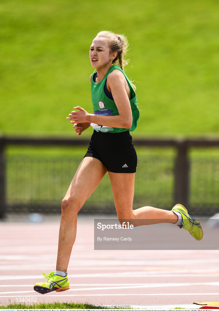 24 June 2017; Abbie Taylor of St Gerard’s Bray, Co. Wicklow, competing during the 3,000 metre race at the Irish Life Health Tailteann School’s Interprovincial Schools Championships at Morton Stadium in Santry, Dublin. Photo by Ramsey Cardy/Sportsfile