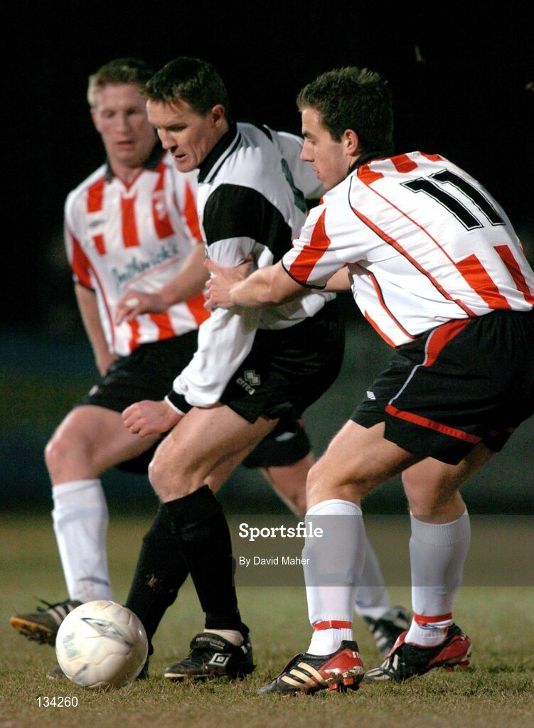 10 March 2004; Martin Reilly, Kildare County, in action against Mark McCrystal and Eamon Doherty, Derry City. Pre-Season friendly, Kildare County v Derry City, Station Road, Kildare. Picture credit; David Maher / SPORTSFILE *EDI*