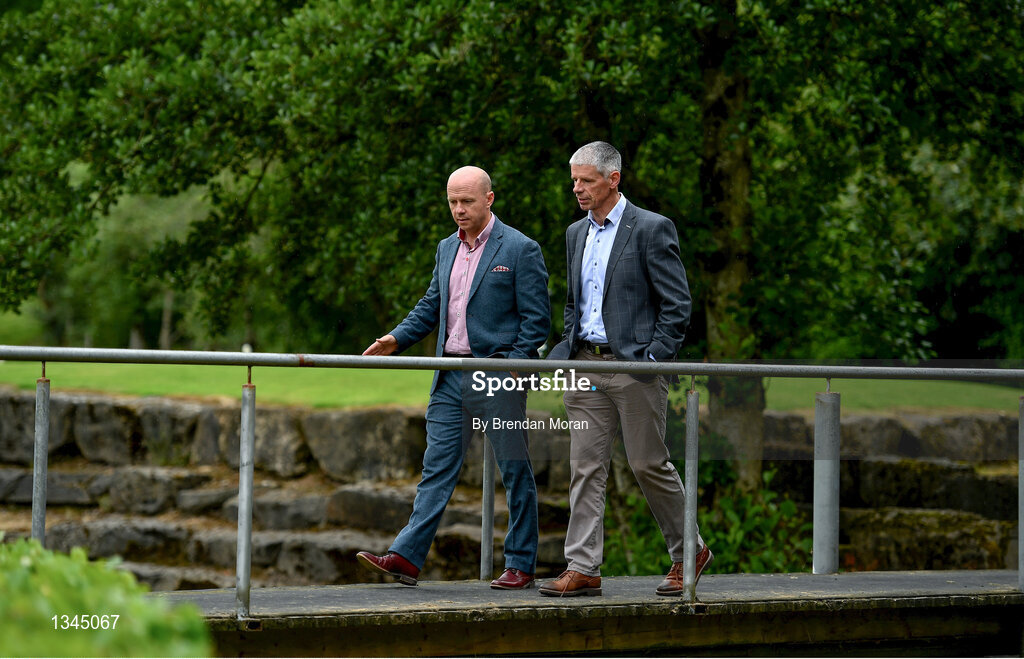4 July 2017; Former Tyrone footballer Peter Canavan, left, and former Down footballer Greg Blaney after a press conference at Fintona Golf Club in Omagh, Co. Tyrone. Photo by Brendan Moran/Sportsfile
