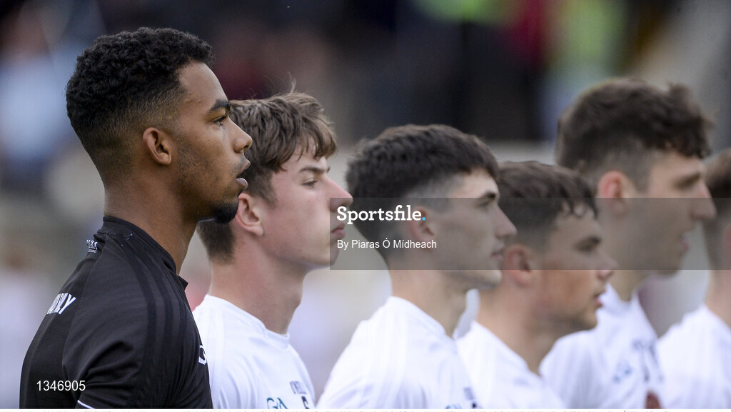 5 July 2017; Aaron O'Neill of Kildare, left, and his team-mates stand for the National Anthem before the Electric Ireland Leinster GAA Football Minor Championship Semi-Final match between Kildare and Dublin at St Conleth's Park in Newbridge, Co Kildare. Photo by Piaras Ó Mídheach/Sportsfile