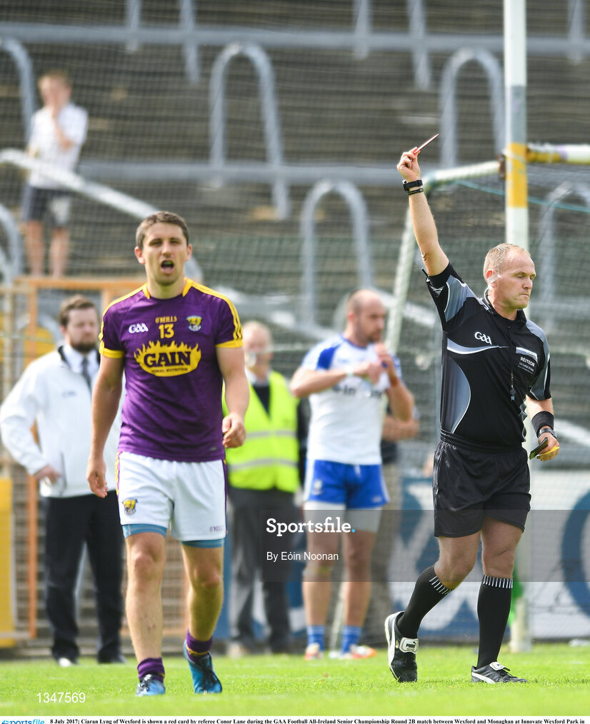 8 July 2017; Ciaran Lyng of Wexford is shown a red card by referee Conor Lane during the GAA Football All-Ireland Senior Championship Round 2B match between Wexford and Monaghan at Innovate Wexford Park in Co Wexford. Photo by Eóin Noonan/Sportsfile