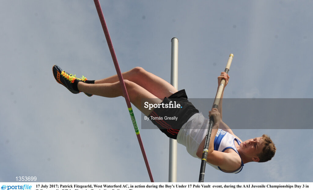 16 July 2017; Patrick Fitzgearld, West Waterford AC, in action during the Boy's Under 17 Pole Vault event, during the AAI Juvenile Championships Day 3 in Tullamore, Co Offaly. Photo by Tomás Greally/Sportsfile