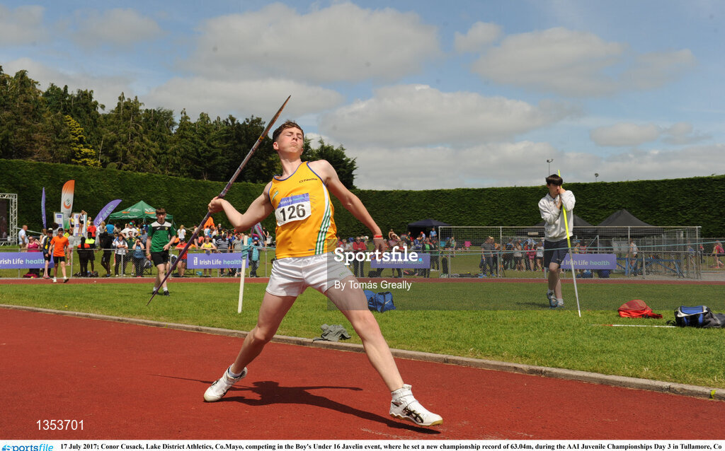 16 July 2017; Conor Cusack, Lake District Athletics, Co.Mayo, competing in the Boy's Under 16 Javelin event, where he set a new championship record of 63.04m, during the AAI Juvenile Championships Day 3 in Tullamore, Co Offaly. Photo by Tomás Greally/Sportsfile