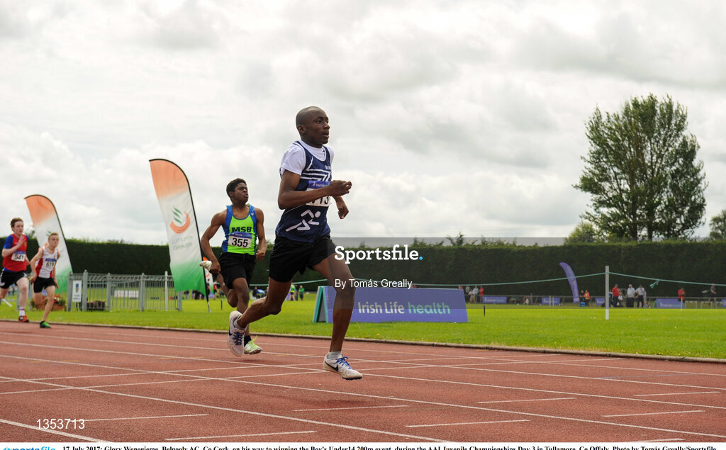 16 July 2017; Glory Wenegieme, Belgooly AC, Co.Cork, on his way to winning the Boy's Under14 200m event, during the AAI Juvenile Championships Day 3 in Tullamore, Co Offaly. Photo by Tomás Greally/Sportsfile