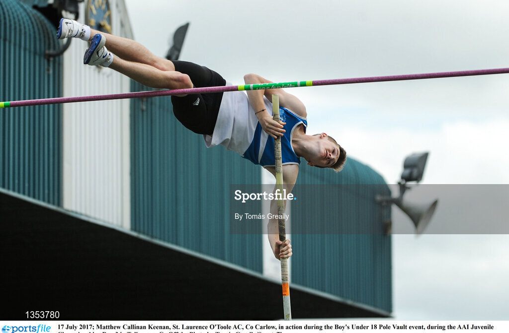 16 July 2017; Matthew Callinan Keenan, St. Laurence O'Toole AC, Co Carlow, in action during the Boy's Under 18 Pole Vault event, during the AAI Juvenile Championships Day 3 in Tullamore, Co Offaly. Photo by Tomás Greally/Sportsfile