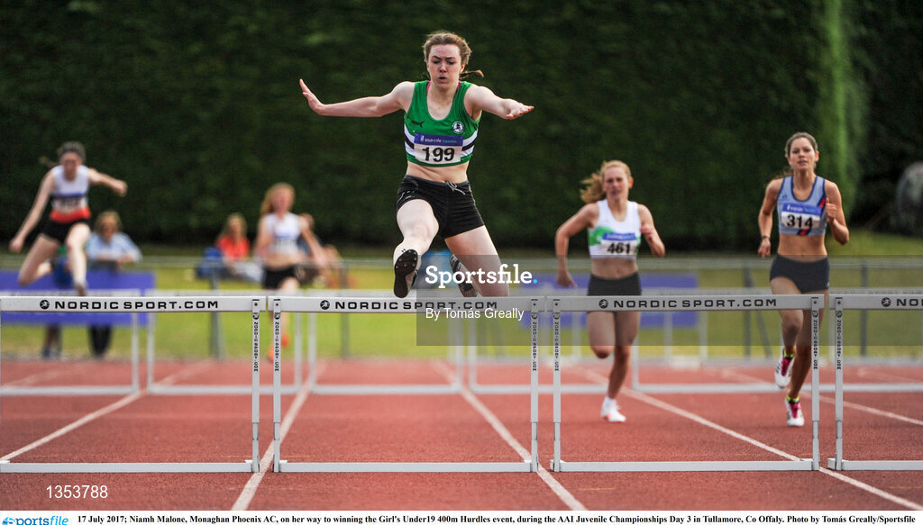 16 July 2017; Niamh Malone, Monaghan Phoenix AC, on her way to winning the Girl's Under19 400m Hurdles event, during the AAI Juvenile Championships Day 3 in Tullamore, Co Offaly. Photo by Tomás Greally/Sportsfile