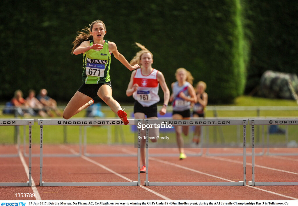 16 July 2017; Deirdre Murray, Na Fianna AC, Co.Meath, on her way to winning the Girl's Under18 400m Hurdles event, during the AAI Juvenile Championships Day 3 in Tullamore, Co Offaly. Photo by Tomás Greally/Sportsfile