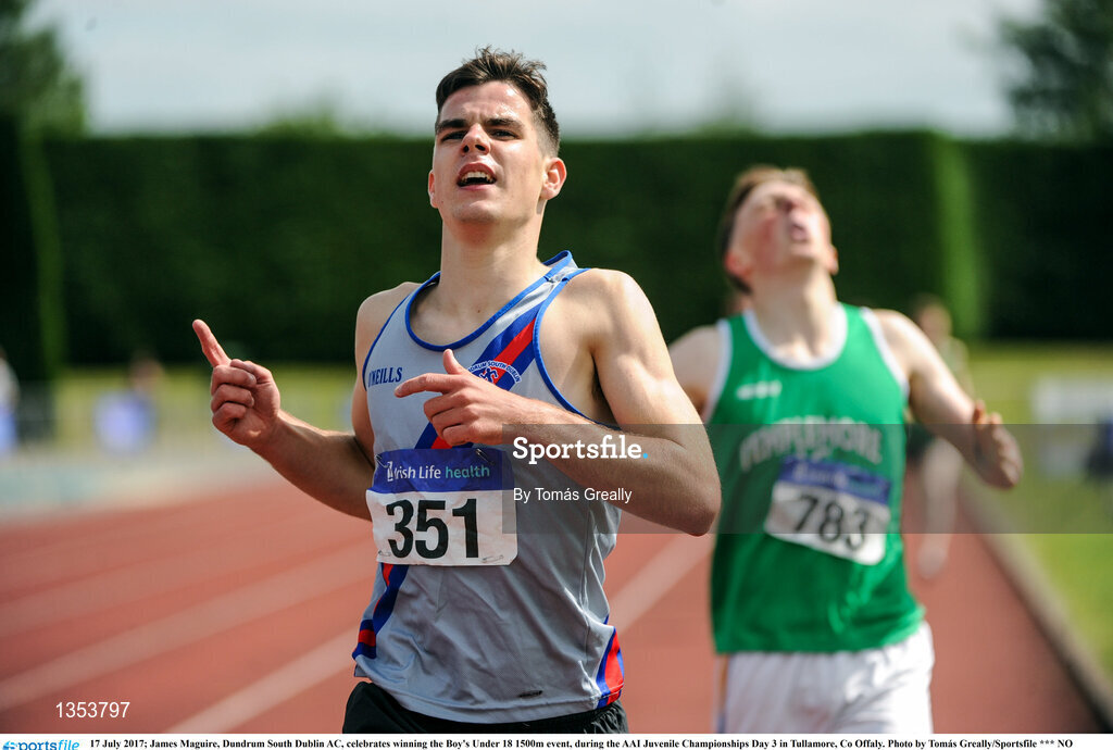 16 July 2017; James Maguire, Dundrum South Dublin AC, celebrates winning the Boy's Under 18 1500m event, during the AAI Juvenile Championships Day 3 in Tullamore, Co Offaly. Photo by Tomás Greally/Sportsfile