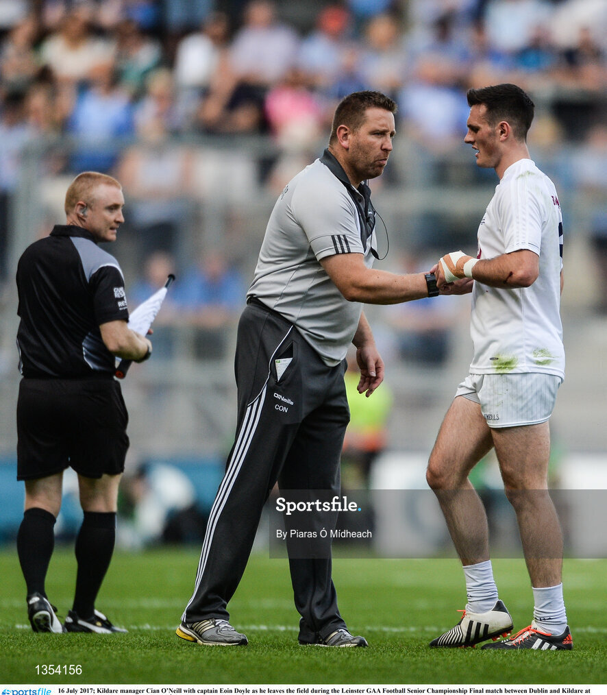 16 July 2017; Kildare manager Cian O’Neill with captain Eoin Doyle as he leaves the field during the Leinster GAA Football Senior Championship Final match between Dublin and Kildare at Croke Park in Dublin. Photo by Piaras Ó Mídheach/Sportsfile