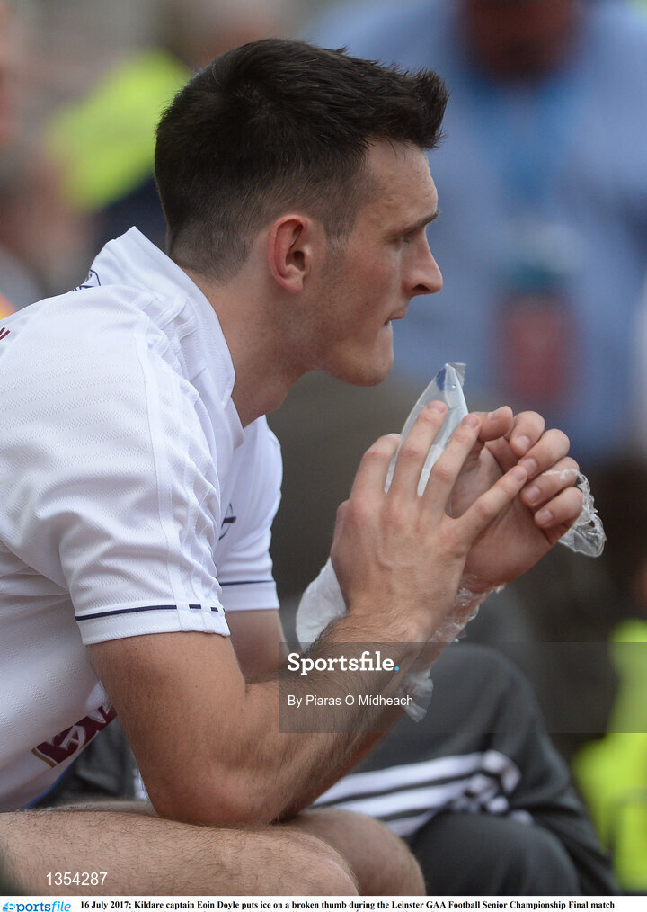 16 July 2017; Kildare captain Eoin Doyle puts ice on a broken thumb during the Leinster GAA Football Senior Championship Final match between Dublin and Kildare at Croke Park in Dublin. Photo by Piaras Ó Mídheach/Sportsfile