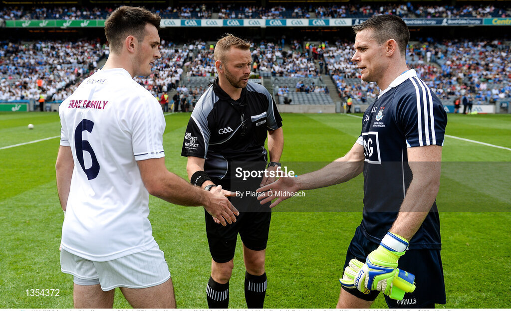 16 July 2017; Referee Anthony Nolan with team captains Eoin Doyle of Kildare, left, and Stephen Cluxton of Dublin before the Leinster GAA Football Senior Championship Final match between Dublin and Kildare at Croke Park in Dublin. Photo by Piaras Ó Mídheach/Sportsfile