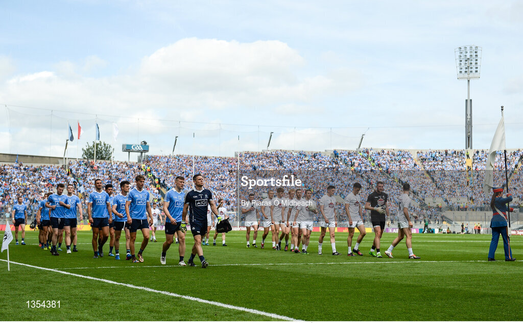 16 July 2017; The Dublin and Kildare teams in the parade before the Leinster GAA Football Senior Championship Final match between Dublin and Kildare at Croke Park in Dublin. Photo by Piaras Ó Mídheach/Sportsfile