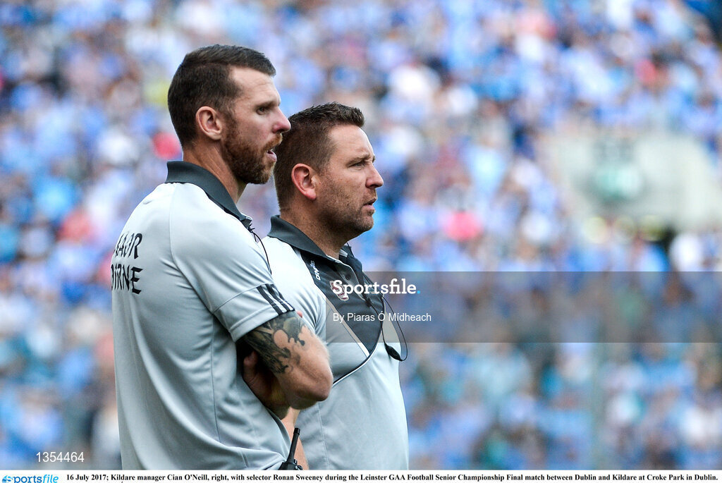 16 July 2017; Kildare manager Cian O'Neill, right, with selector Ronan Sweeney during the Leinster GAA Football Senior Championship Final match between Dublin and Kildare at Croke Park in Dublin. Photo by Piaras Ó Mídheach/Sportsfile