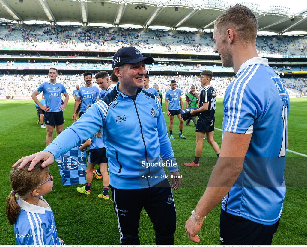 16 July 2017; Paul Mannion of Dublin and manager Jim Gavin with Angelina Rider after the Leinster GAA Football Senior Championship Final match between Dublin and Kildare at Croke Park in Dublin. Photo by Piaras Ó Mídheach/Sportsfile
