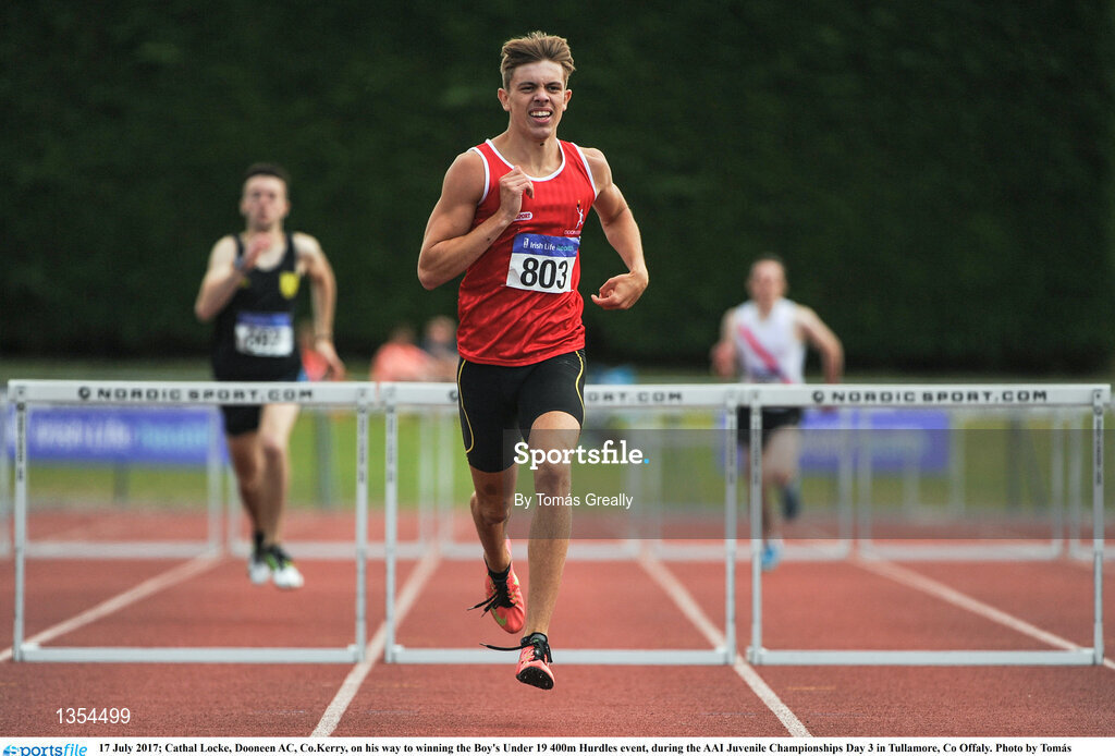 16 July 2017; Cathal Locke, Dooneen AC, Co.Kerry, on his way to winning the Boy's Under 19 400m Hurdles event, during the AAI Juvenile Championships Day 3 in Tullamore, Co Offaly. Photo by Tomás Greally/Sportsfile