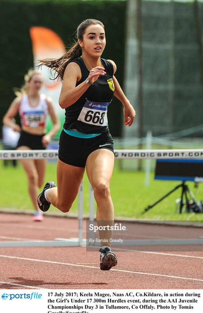 16 July 2017; Keela Magee, Naas AC, Co.Kildare, in action during the Girl's Under 17 300m Hurdles event, during the AAI Juvenile Championships Day 3 in Tullamore, Co Offaly. Photo by Tomás Greally/Sportsfile