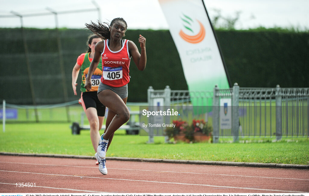 16 July 2017; Oyimkansola Adedeji, Dooneen AC, Co.Kerry, in action during the Girl's Under 15 250m Hurdles event, during the AAI Juvenile Championships Day 3 in Tullamore, Co Offaly. Photo by Tomás Greally/Sportsfile