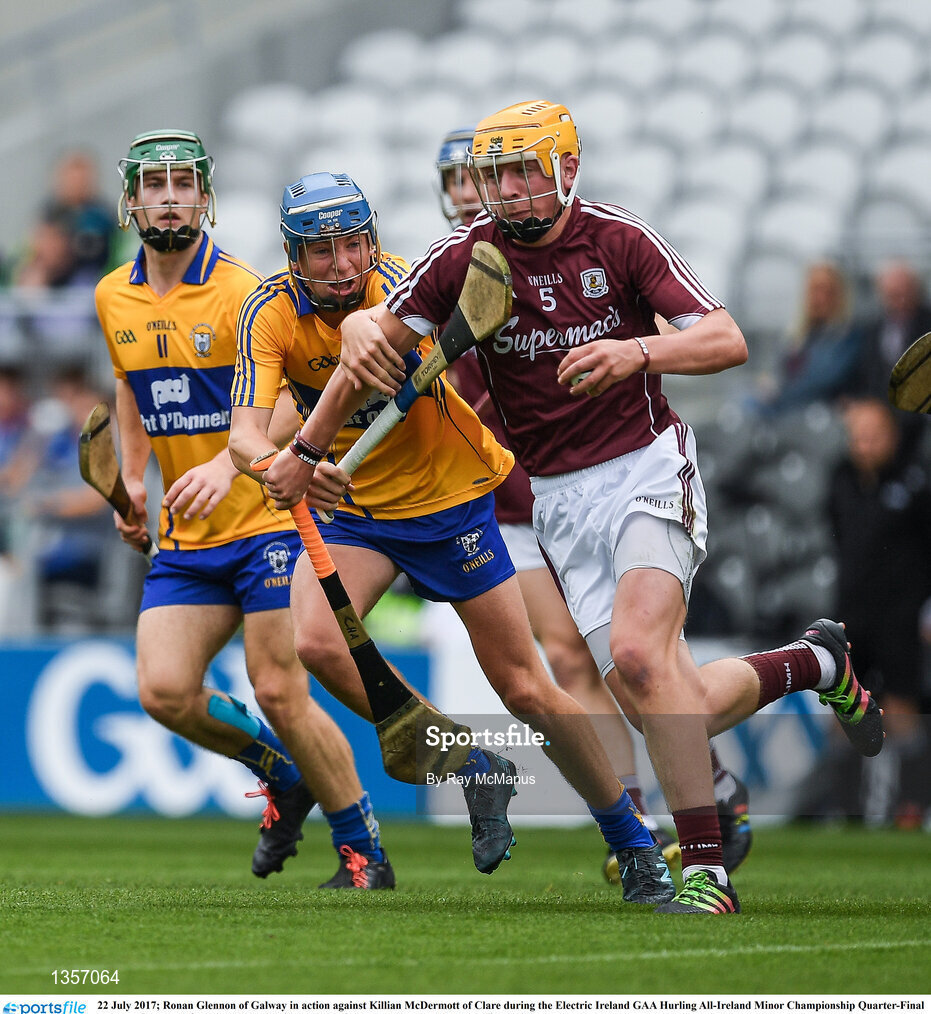 22 July 2017; Ronan Glennon of Galway in action against Killian McDermott of Clare during the Electric Ireland GAA Hurling All-Ireland Minor Championship Quarter-Final between Clare and Galway at Páirc Uí Chaoimh in Cork. Photo by Ray McManus/Sportsfile