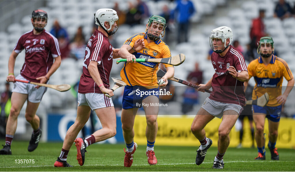 22 July 2017; Riain Considine of Clare in action against Darren Morrissey, left, and Caimin Killeen of Galway during the Electric Ireland GAA Hurling All-Ireland Minor Championship Quarter-Final between Clare and Galway at Páirc Uí Chaoimh in Cork. Photo by Ray McManus/Sportsfile
