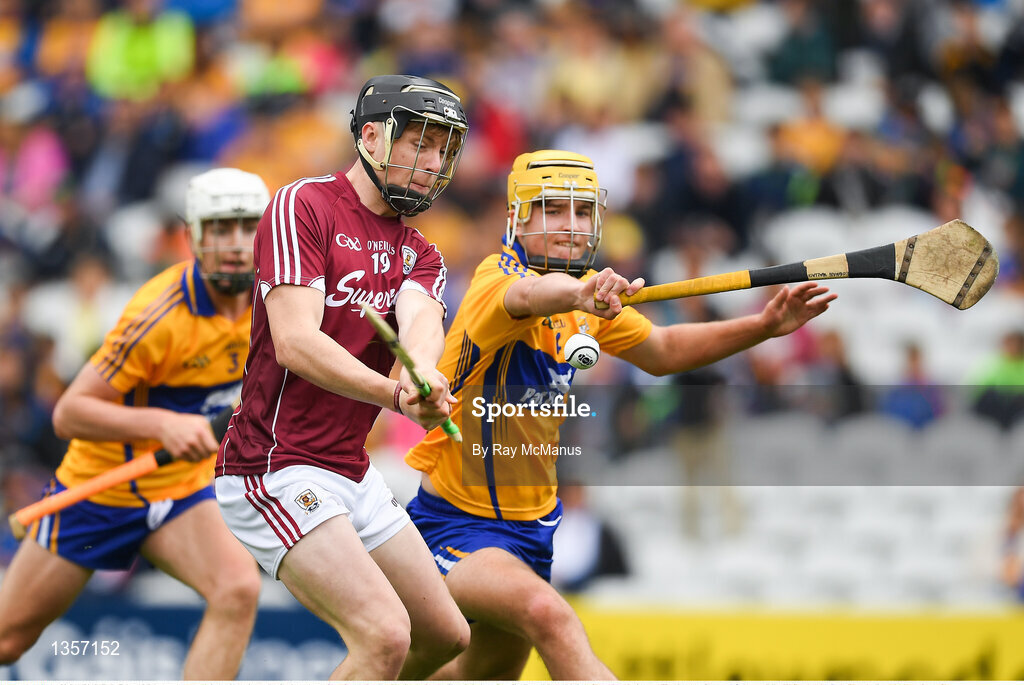 22 July 2017; Enda Fahey of Galway scores a goal, in the 54th minute, despite the pressure from Clare's Bradley Higgins during the Electric Ireland GAA Hurling All-Ireland Minor Championship Quarter-Final between Clare and Galway at Páirc Uí Chaoimh in Cork. Photo by Ray McManus/Sportsfile