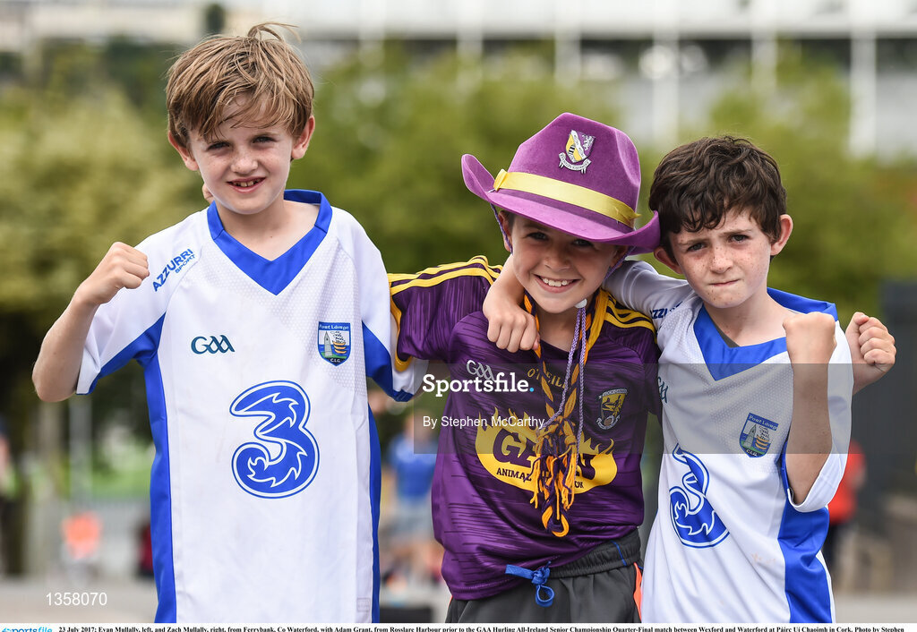 23 July 2017; Evan Mullally, left, and Zach Mullally, right, from Ferrybank, Co Waterford, with Adam Grant, from Rosslare Harbour prior to the GAA Hurling All-Ireland Senior Championship Quarter-Final match between Wexford and Waterford at Páirc Uí Chaoimh in Cork. Photo by Stephen McCarthy/Sportsfile